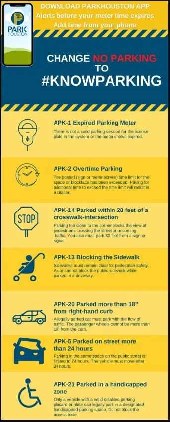 APK-14 Parked within 20 feet of a crosswalk-intersection - Parking too close to the corner blocks the view of pedestrians crossing the street or oncoming traffic. You also must park 30 feet from a sign or signal.